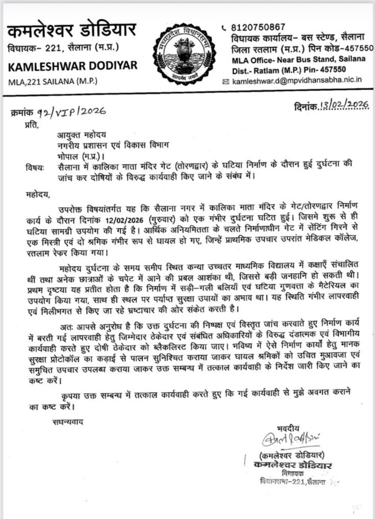 विधायक डोडियार ने अपने शिकायत पत्र में बताया कि 12 फरवरी 2026 को कालिका माता मंदिर के गेट (तोरणद्वार) निर्माण कार्य के दौरान निर्माणाधीन संरचना की सेंटीग गिरने से एक मिस्त्री सहित दो श्रमिक गंभीर रूप से घायल हो गए थे। घायलों को प्राथमिक उपचार के बाद मेडिकल कॉलेज रतलाम रेफर किया गया। उन्होंने आरोप लगाया कि निर्माण कार्य में घटिया सामग्री का उपयोग किया गया तथा पर्याप्त सुरक्षा इंतजाम नहीं किए गए, जिससे बड़ा हादसा हो गया।