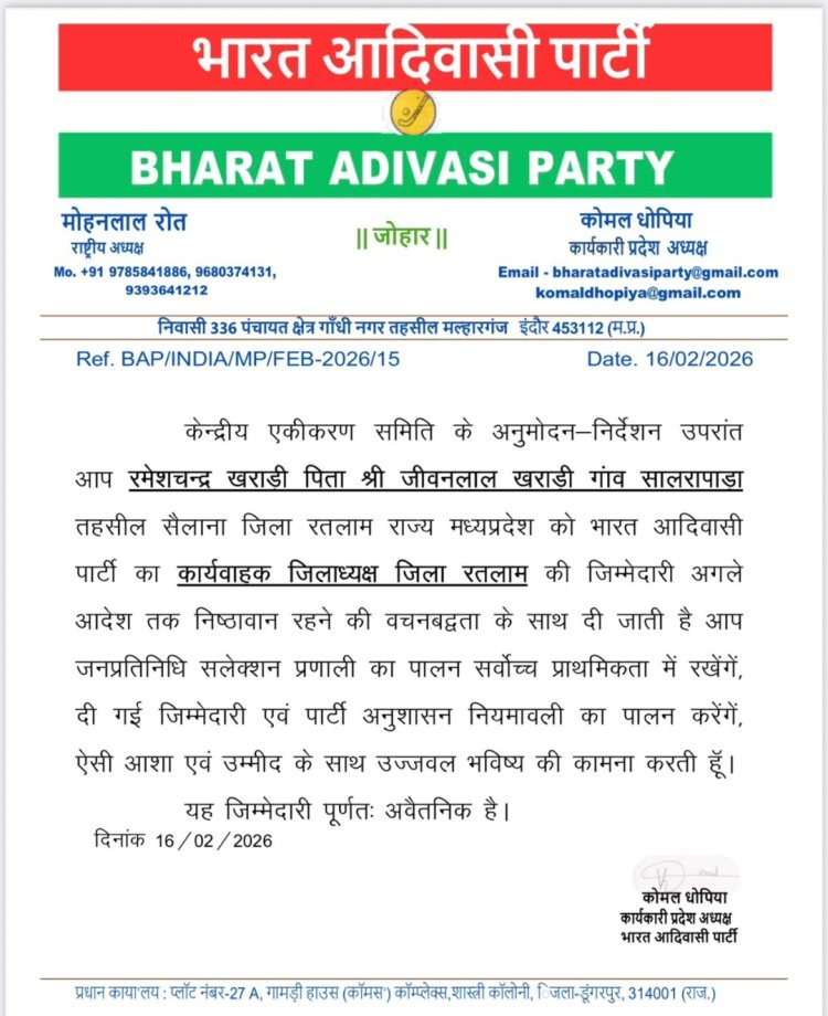 रतलाम/ सैलाना। भारत आदिवासी पार्टी की जिला और ब्लॉक की कार्यकारिणी भंग करने के बाद सैलाना जनपद के सालरापाड़ा सरपंच रमेश चंद्र खराडी को जिला अध्यक्ष (कार्यवाहक) नियुक्त किया है।