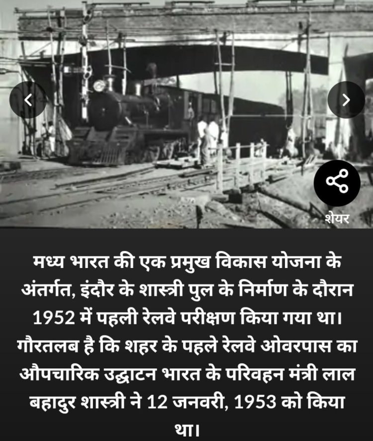 आजादी के बाद रेलवे ने शास्त्री ब्रिज का निर्माण शुरू कियाऔर 4/5साल के अथक परिश्रम के बाद 1952में ब्रिज का परीक्षण हुआ और फिर लगभग एक करोड़ की लागत से बने इस ब्रिज का 12जन 1953को लाल बहादुर शास्त्री ने इसका उद्घाटन किया।तब यह बहुत बड़ा लगता था क्यों कि गिनती के मोटर वाहन थे,ज्यादातर साइकिलें, घोड़ा गाड़ी और बैलगाड़ियां ही गुजरती थीं।इसकी बनावट इतनी खूबसूरत थी कि इंदौर के लोग इसपर से गुजरते हुए अपनी शान समझते थे।आती जाती रेलों को देखना चहकती चिड़िया के झुंड,ठंडी ठंडी हवा का अहसास सब कुछ निराला था,, बीते वर्षों में इस पुल से बड़ी बड़ी हस्तियां गुजरी हैं, इंदौर में ब्याही नई दुल्हन को इस ब्रिज पर घुमाने लाना बड़ा रोमांटिक लगता था।